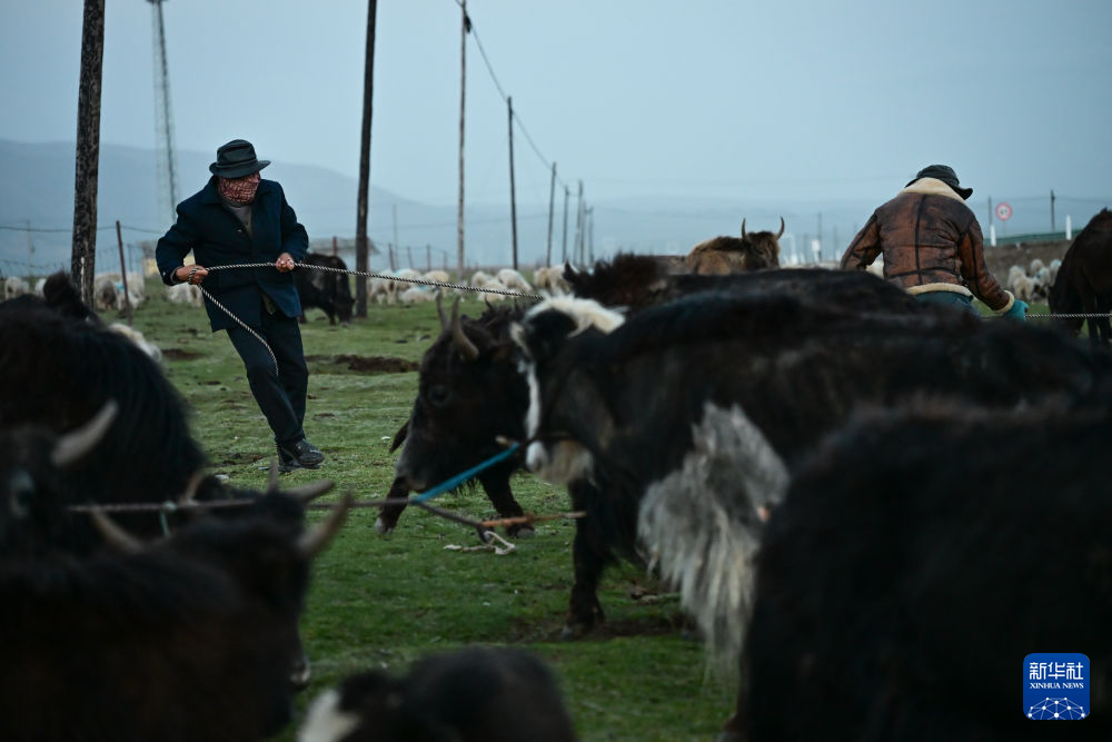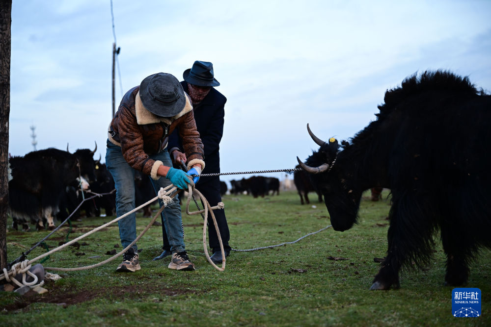 6月25日下午,万卓(左)与先巴尖措在临时休息点上拴牦牛,防止牦牛在夜间混入其他牧民家转场的牛群中。新华社记者 齐芷玥 摄