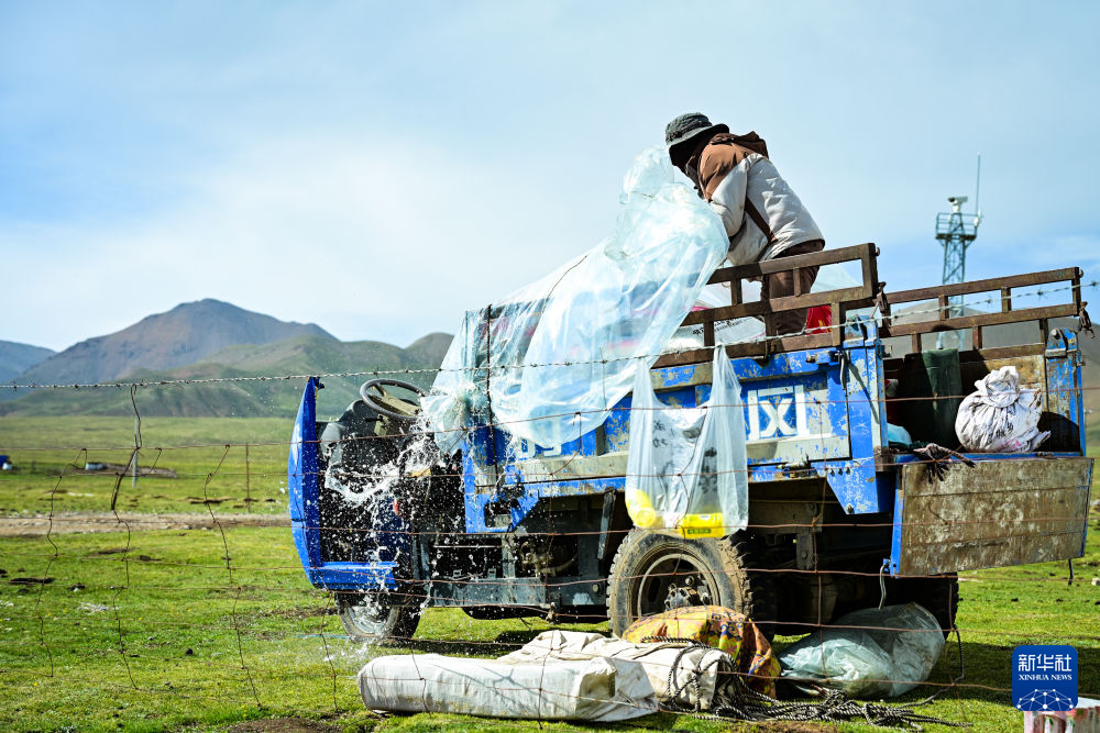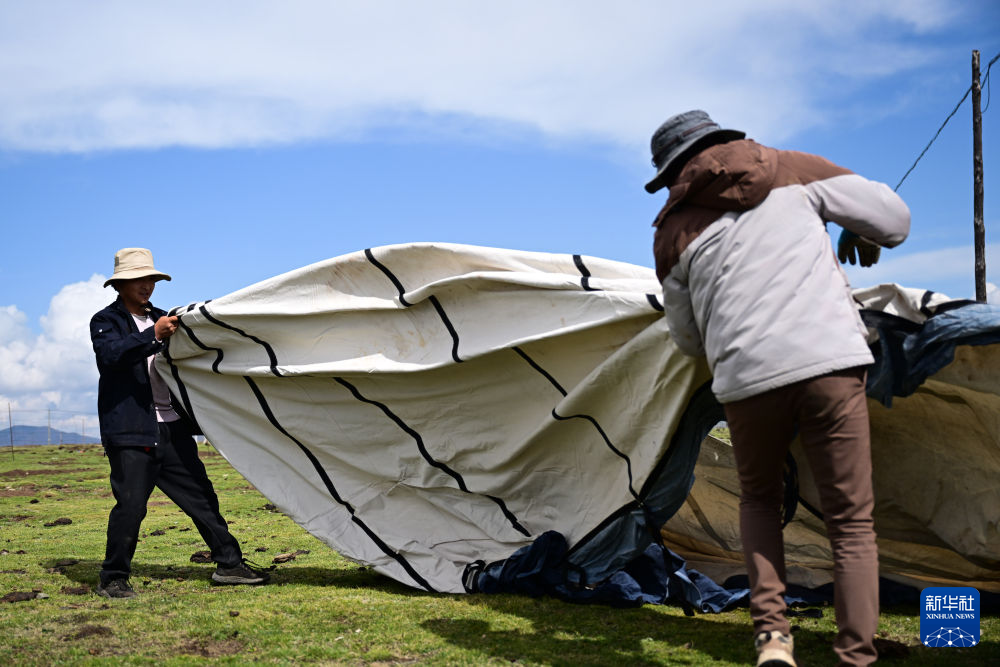 6月25日下午,先巴尖措在为搭帐篷做准备。新华社记者 齐芷玥 摄