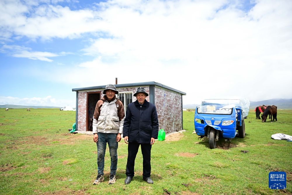 6月26日,万卓(右)与外甥先巴尖措在夏牧场的板房前。随着基础设施改善,牧民们在夏牧场会搭建简易板房居住,相较于帐篷更加暖和。新华社记者 张龙 摄