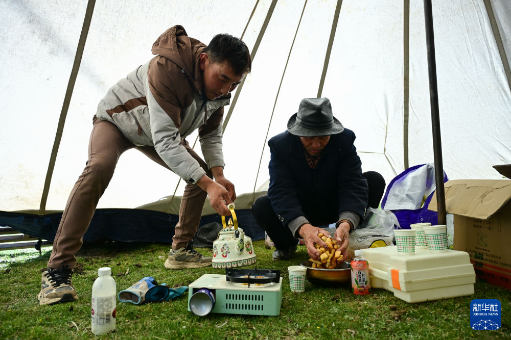 6月25日下午,万卓与先巴尖措在帐篷内准备晚饭。新华社记者 齐芷玥 摄