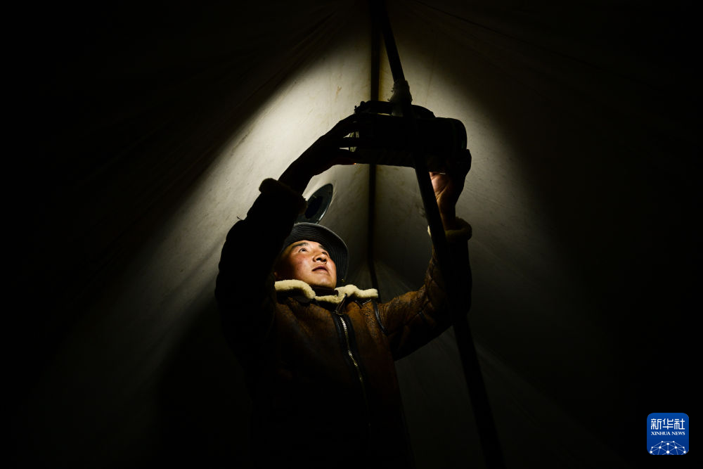 6月25日夜间,先巴尖措在帐篷内摆放灯具照明。新华社记者 张龙 摄