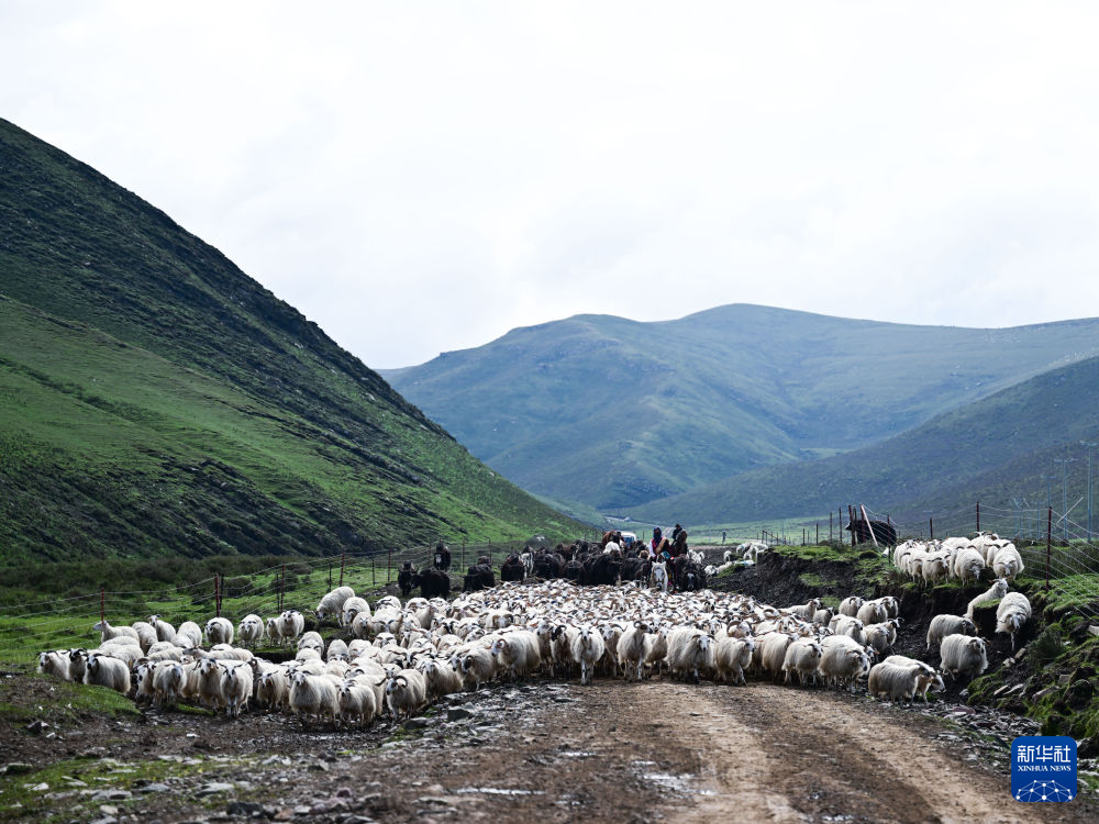 6月25日,默勒镇才什土村的牧民在转场。为了防止羊群混到一起,万卓与外甥先巴尖措在后方骑着马控制羊群。 新华社记者 张龙 摄