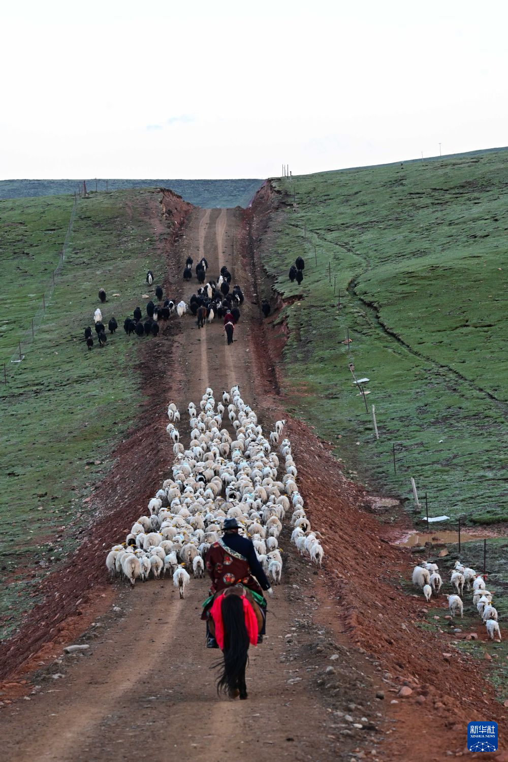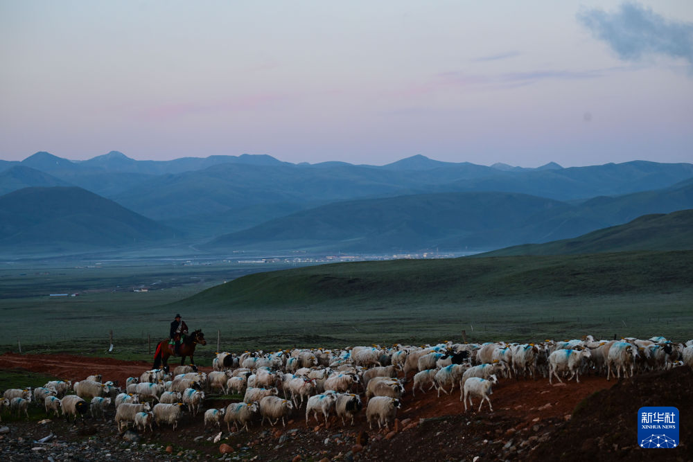 6月25日清晨,万卓赶着羊群转场。新华社记者 张龙 摄
