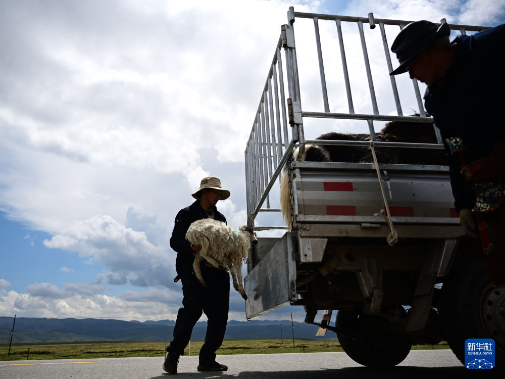 6月25日中午,因为转场途中一只羊羔体力不支,万卓的女婿扎西尖木措(左)开着车来转运。新华社记者 张龙 摄