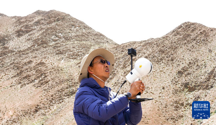 6月23日,侯光良对岩画及所在地形进行三维扫描和数据采集。新华社记者 王艳 摄