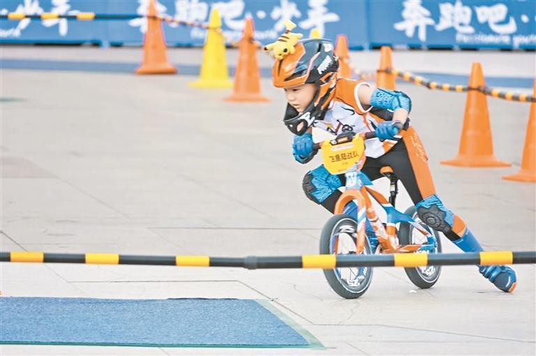 来自甘肃省天水市的参赛选手家长于玲倩紧张地看着赛道上的儿子,捏紧了拳头为孩子加油鼓劲。“子涵,要勇敢,加油!”直到看到孩子顺利地冲过终点线,她高兴地说:“我家孩子3岁就开始玩滑步车了,就是锻炼他的平衡能力和身体素质,至于取得什么样的成绩我们不在乎,孩子快乐就好。”