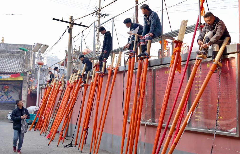 新华社西宁2月14日电(记者张子琪)春节将至,青海省西宁市湟中区鲁沙尔镇社火队也在紧锣密鼓排练。高跷队的队员脚踩木跷,伴随着铿锵有力的鼓点灵活变换队形,步伐稳健,姿态潇洒。