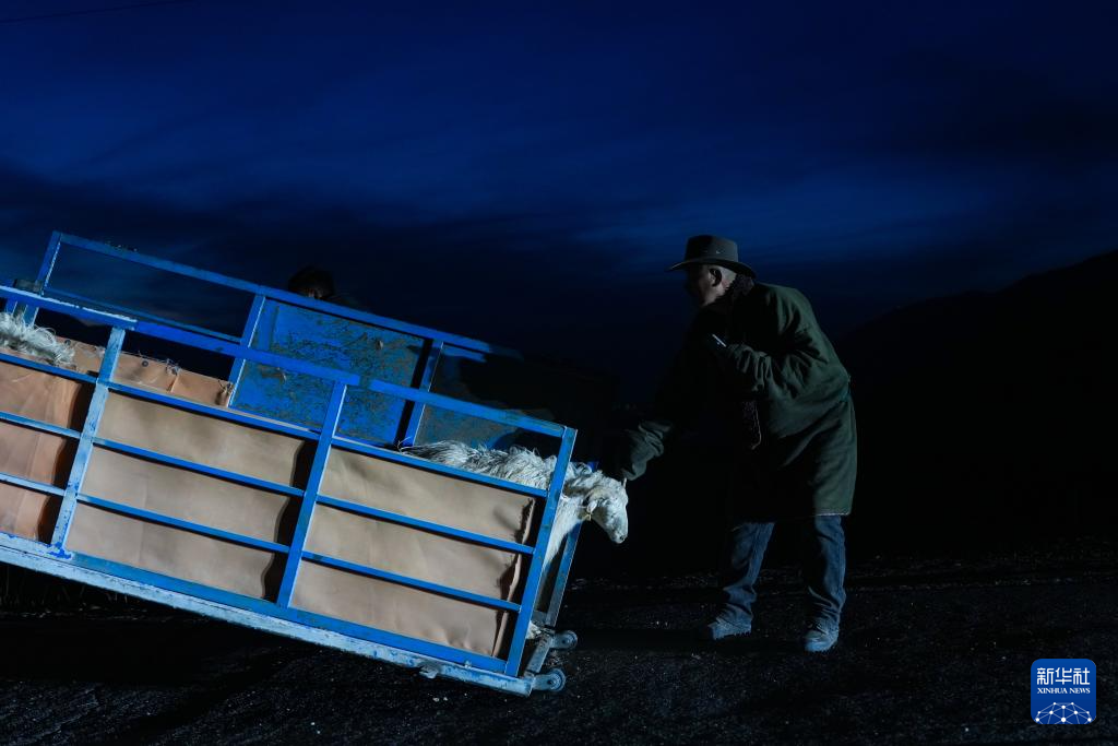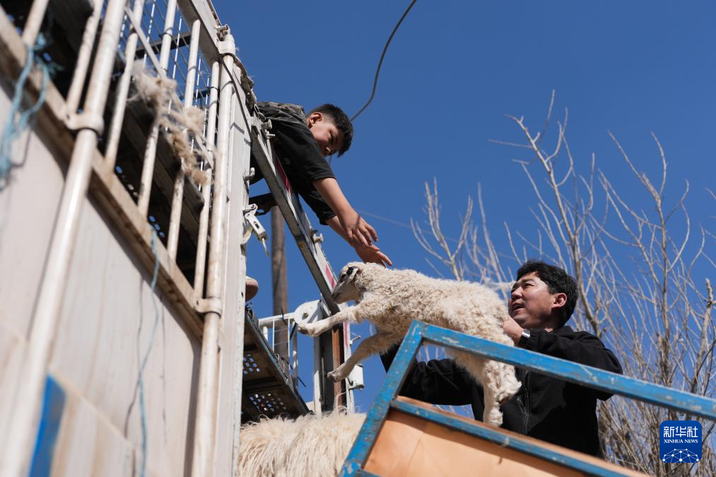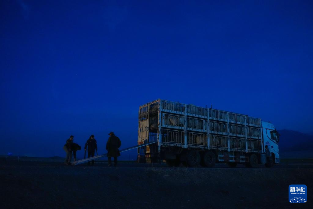 3月7日,在青海省海北藏族自治州祁连县阿柔乡草大板村,东宝准备将车辆中的羊群放归草原。新华社记者 张龙 摄