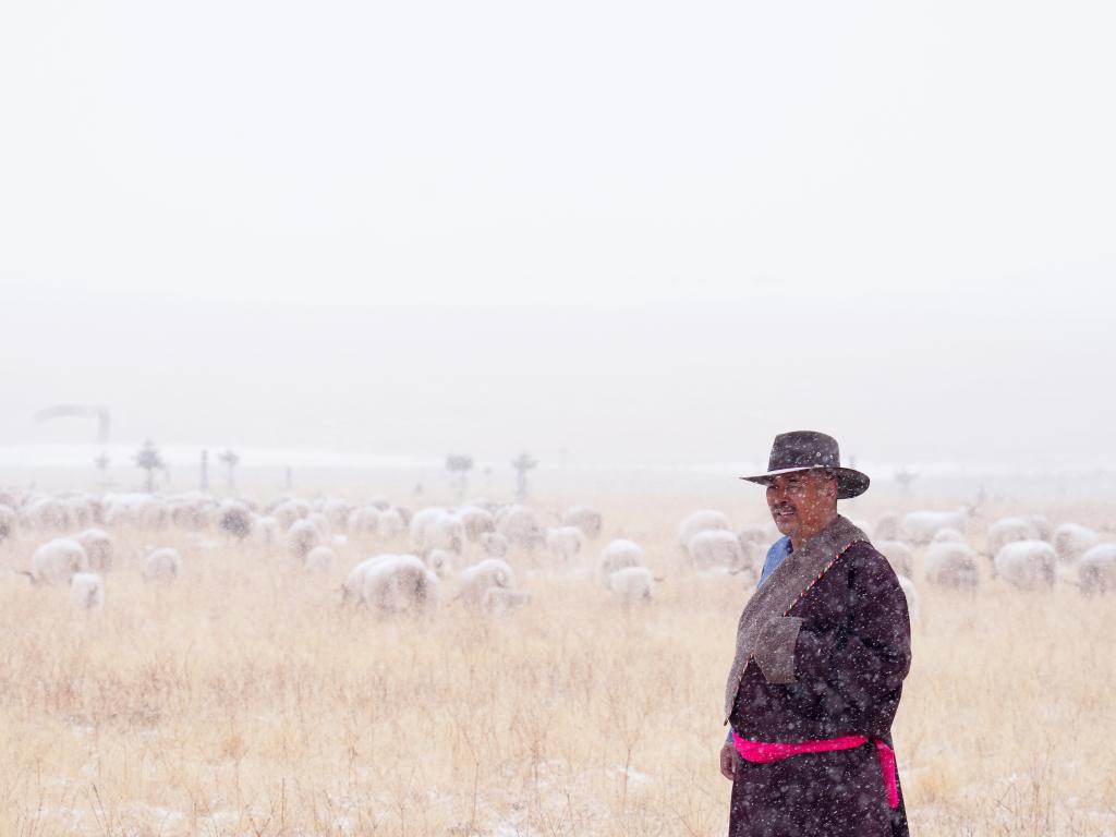 羊群乘车从河西走廊驶来略显萎靡,但经过近半年休整的祁连山草原牧草长势良好,新生的羊羔放归草原时活力满满,春雪中,牧民东宝充满了希望。