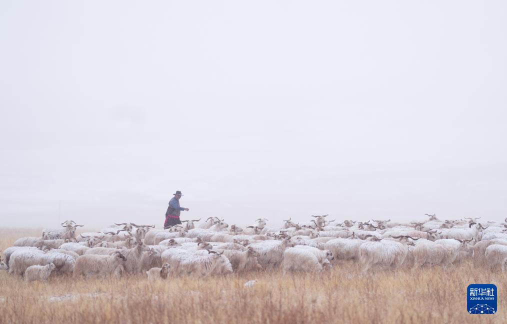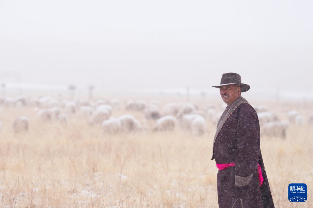 3月8日,在青海省海北藏族自治州祁连县,牧人在雪中放牧。新华社记者 张龙 摄